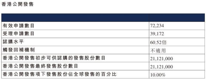 配售情况:72234人认购,这次公配60.52倍,由于执行分配机制B, 回拨比率无,国配有7.88倍,一手中签率35.00%,认购50手稳中1手,同时乙组719人申购,其中顶头槌申购5张,获配率0.93%-2.60%。