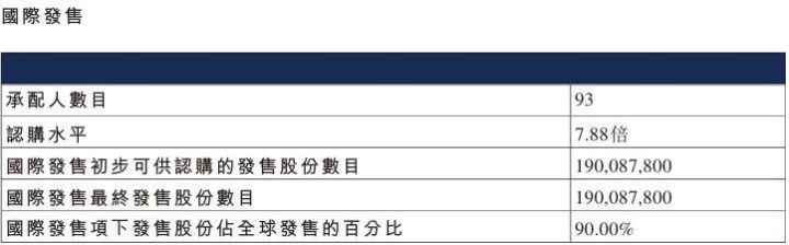 京东工业国际配售总共93人,认购额7.88倍。
